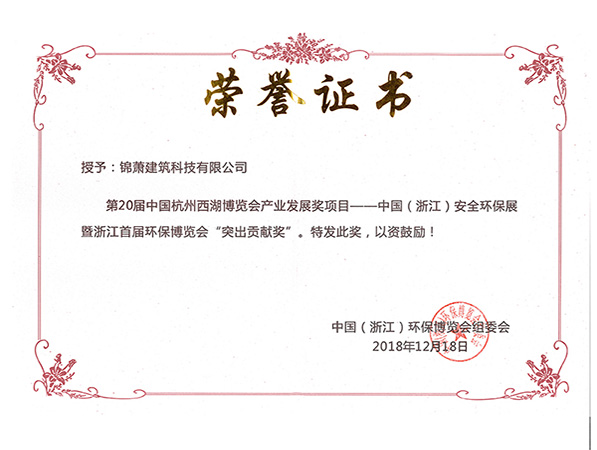 中國安全環(huán)保展暨浙江首屆環(huán)保博覽會突出貢獻(xiàn)獎