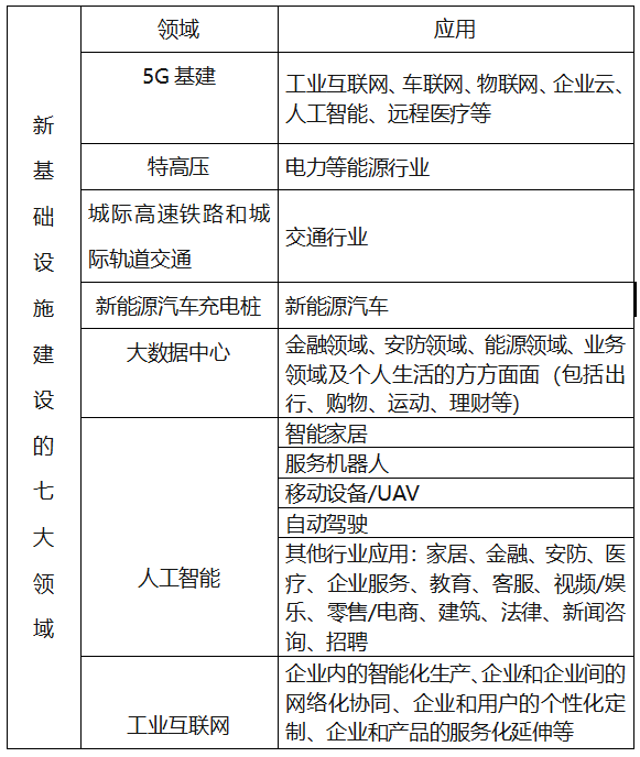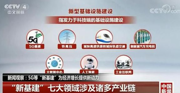 不過,關于新型基礎設施建設的具體范圍,在中央相關文件中并沒有給出十分明確的定義,但在中央電視臺中文國際頻道的定義中,新型基礎設施建設是指發(fā)力于科技端的基礎設施建設,主要包含5G基建、特高壓、城際高速鐵路和城際軌道交通、新能源汽車充電樁、大數(shù)據(jù)中心、人工智能、工業(yè)互聯(lián)網(wǎng)等七大領域,涉及到通信、電力、交通、數(shù)字等多個社會民生重點行業(yè)。相對來說,中央電視臺對“新型基礎設施建設”的范圍定義更加廣泛;到目前為止,這一定義也獲得了更大的社會認同度。